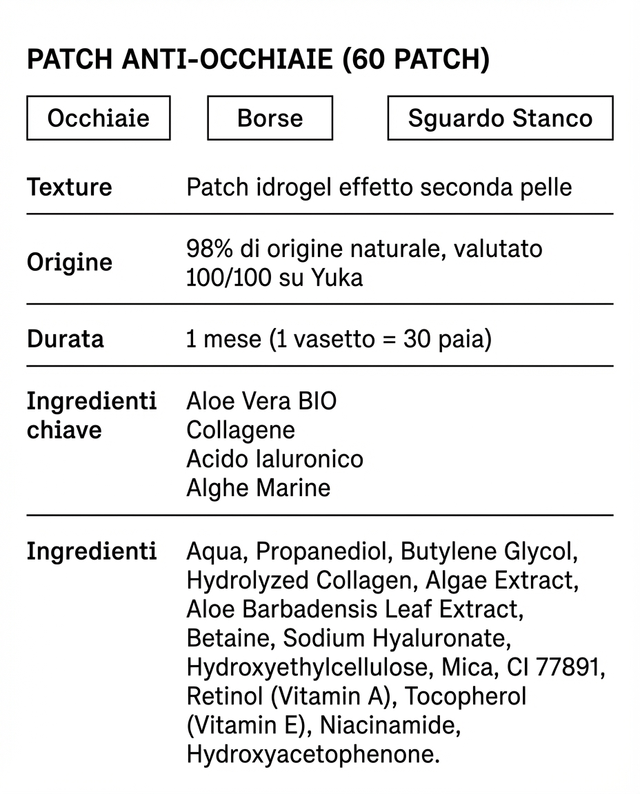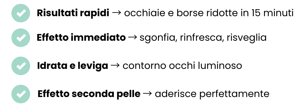 il suo formato patch hydrogel agisce come un trattamento express per attenuare visibilmente borse, occhiaie e segni di stanchezza.